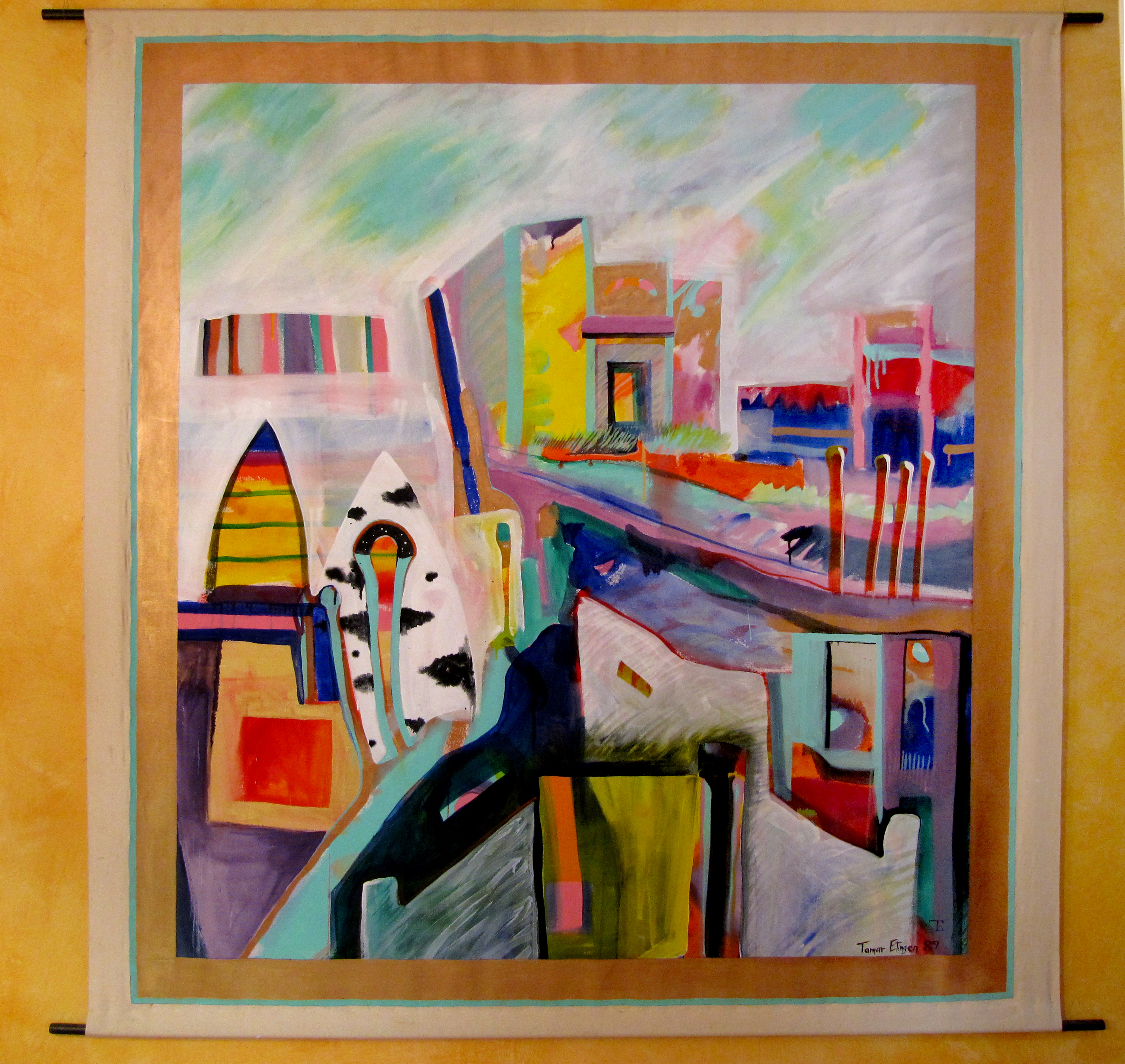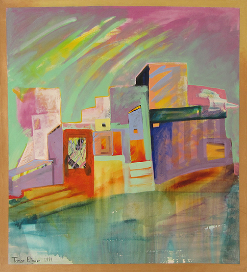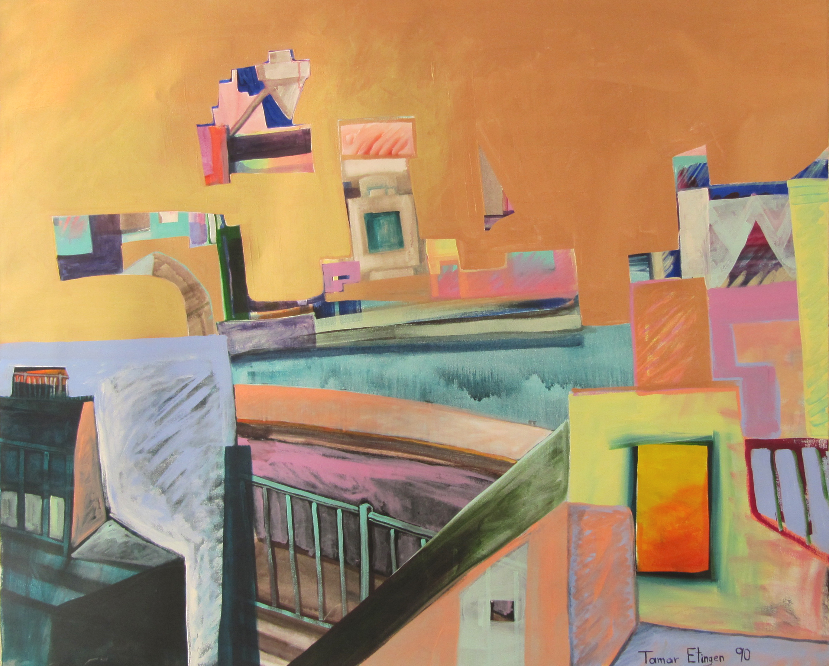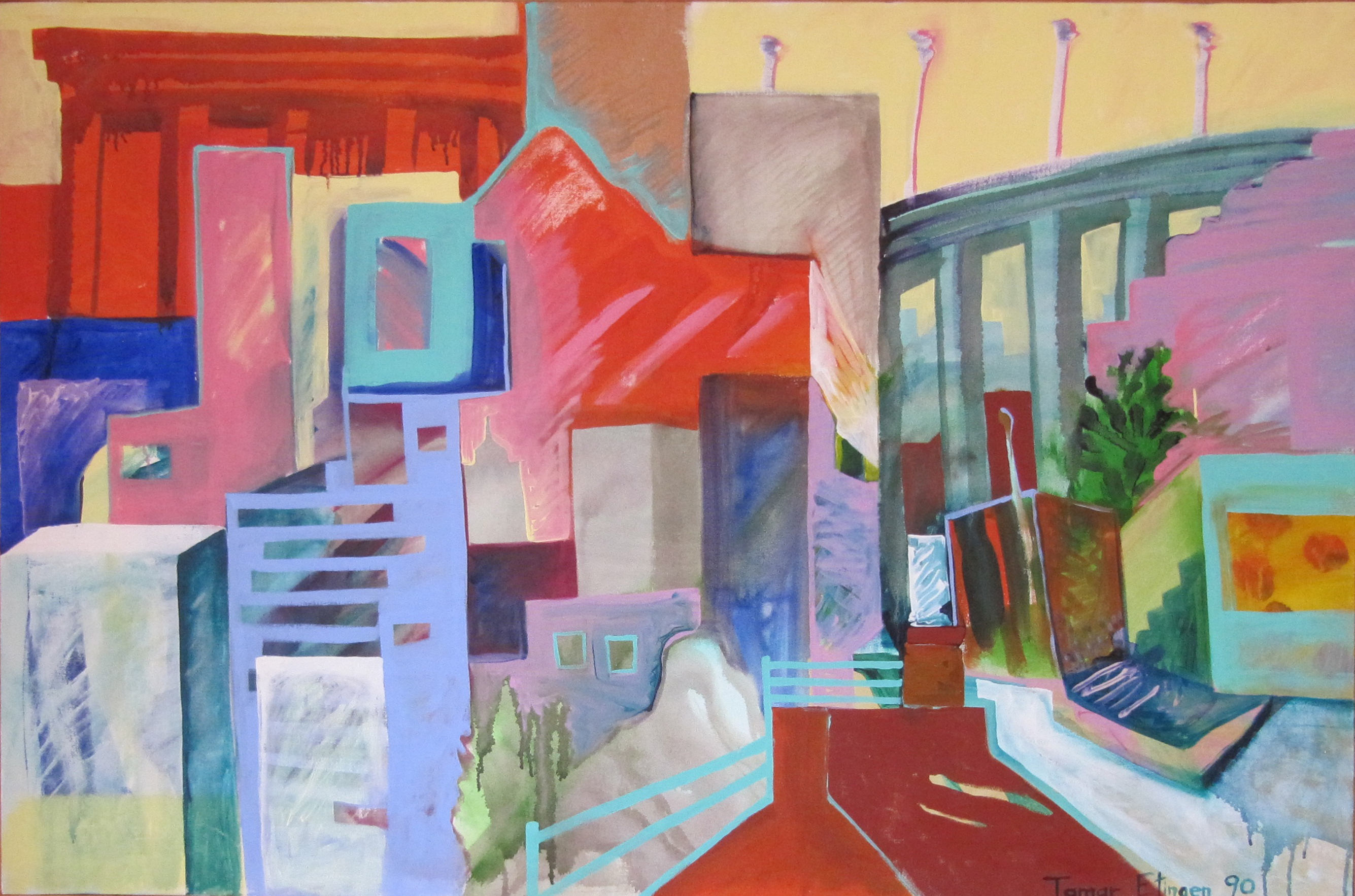 In the 1980’s Tamar began creating large abstract architectural landscapes. Reviewing the paintings more recently, she noticed that she’d been discovering a style that she’s used and refined in her present work. Through the Cambridge Arts Council’s Art Lending Program (2016-present), canvases from this series were hung in the reception area of the Cambridge Google headquarters, the offices of Unum Therapeutics and other locations.