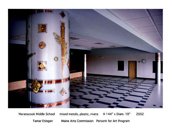 In 2002, metalsmith Tamar Etingen was chosen by the Maine Arts Commission to design, fabricate and install decorative metal capitals on five anodized aluminum columns in the new building of the Maranacook Middle School. Columns 1, 2, and 3 are in the Cafeteria. Column 4 is on the first floor directly outside the Cafeteria and to the right of the first floor entrance. Column 5 is on the second floor in the hallway leading to classrooms and offices. Ms. Etingen proposed a design using a mix of geometric and organic shapes in a lively abstract composition. A design vocabulary of shared forms was employed, giving each column a design which is unique but also related to the other columns. The unique design of each column is intended to give identity to each site. In the Cafeteria where there are three columns in one location, the interplay of the three designs and their relationship to each other generates an entertaining visual environment as people move through the room.