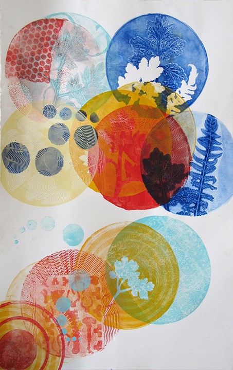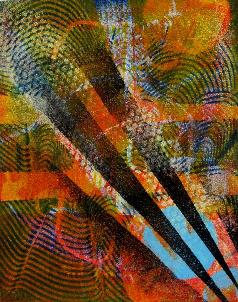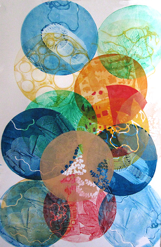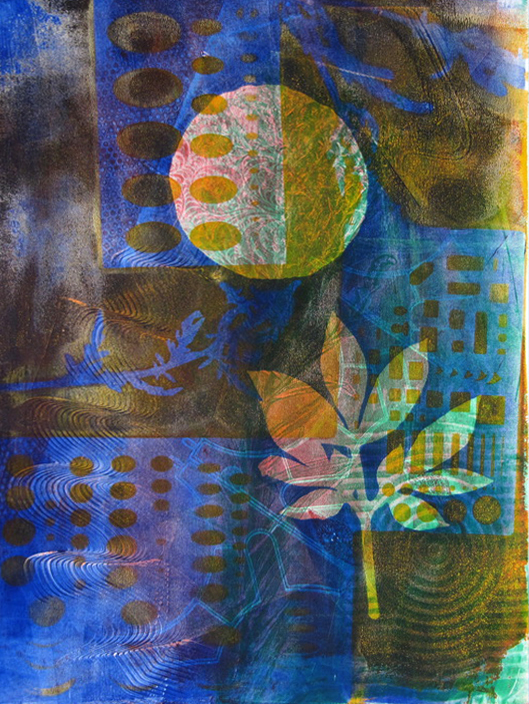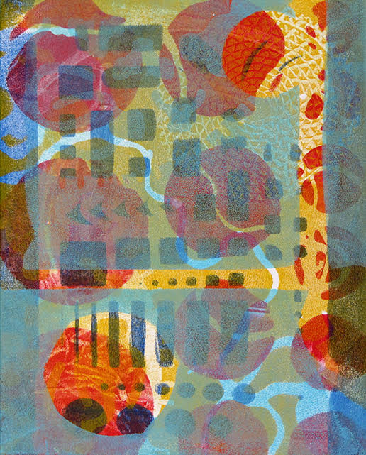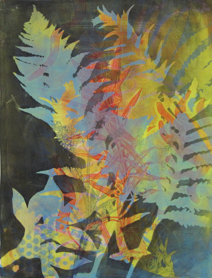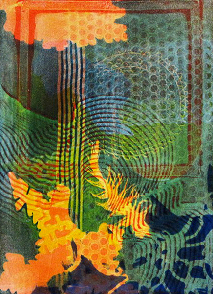 Since 2008, Tamar has been obsessed with the luminous color and abstract layered imagery that she’s developed using gelatin plate printmaking. She has been fascinated with this process and its ability to include found objects and plant materials. The resulting tension between manufactured and organic forms has been a major element in her work.