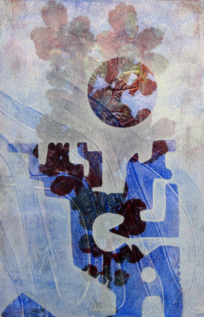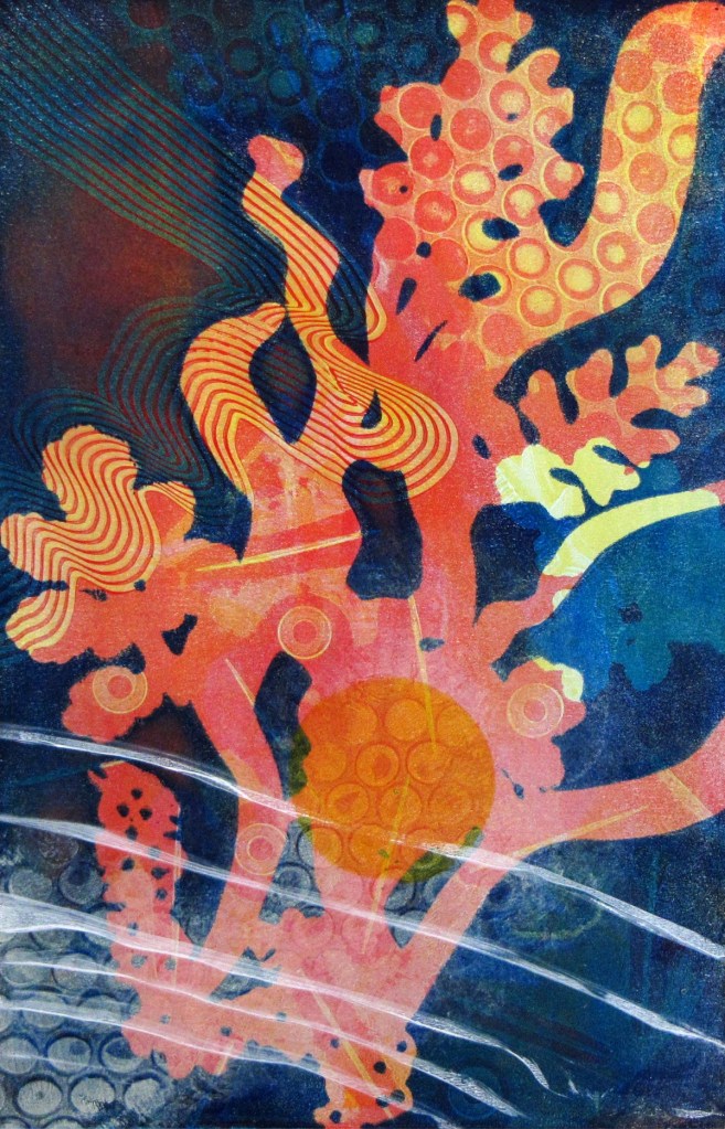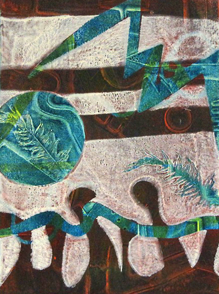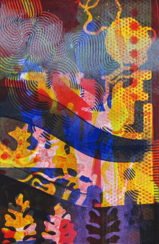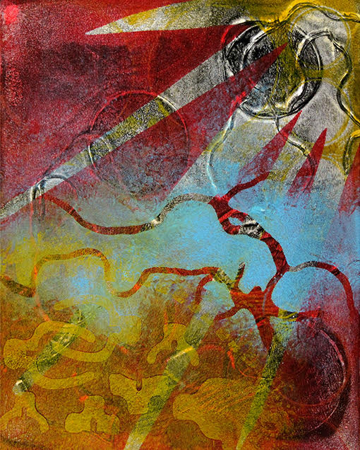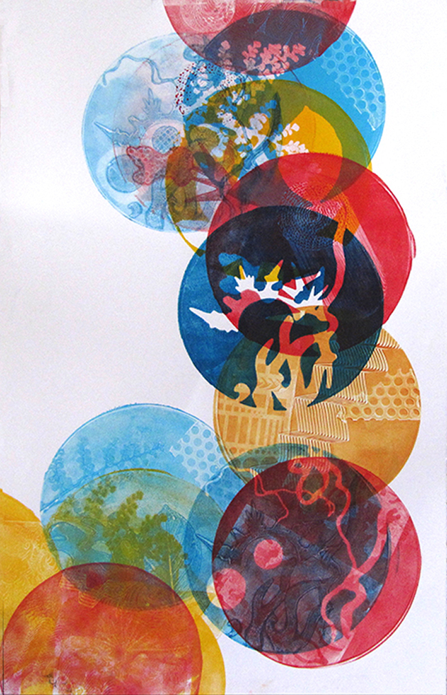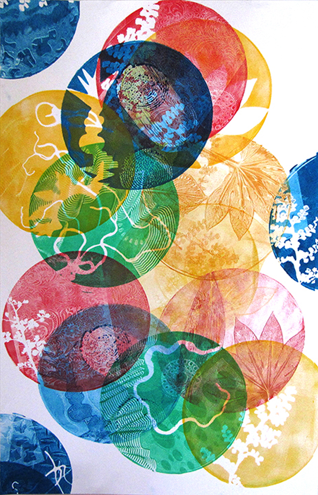 Since 2008, Tamar has been obsessed with the luminous color and abstract layered imagery that she’s developed using gelatin plate printmaking. She has been fascinated with this process and its ability to include found objects and plant materials. The resulting tension between manufactured and organic forms has been a major element in her work.