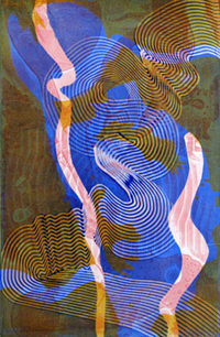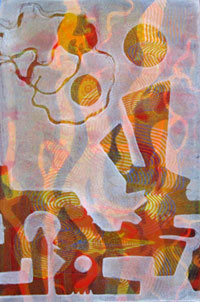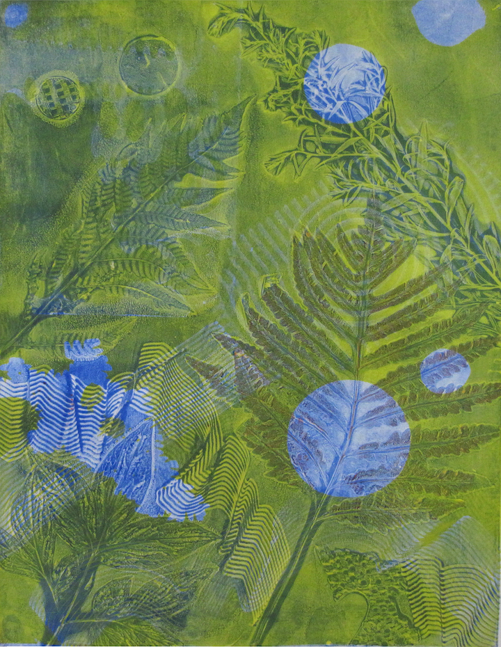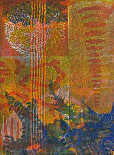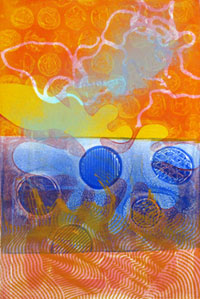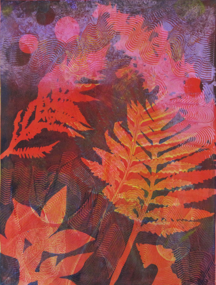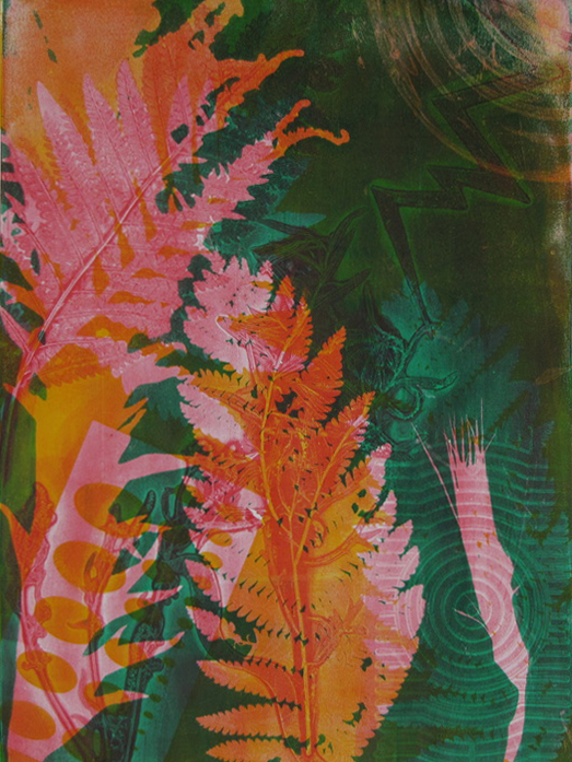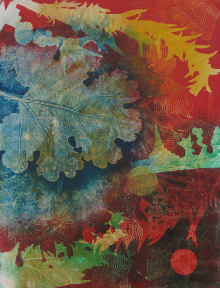 Gelatin Plate is a non-toxic, low-tech and inexpensive printmaking technique, which requires NO PRESS. Luminous, multi-layered monoprints and monotypes can be created using water-based acrylic paint or printmaking inks. Ink is applied with a brayer (roller) to a plate or pad of very concentrated pharmaceutical gelatin. Images can be painted directly on the plate or, using subtractive techniques, they may be achieved by touching the inked plate with various textural objects. The latter method can allow the artist to attain near-photographic clarity and it is especially effective using plant material. Gelatin Plate printmaking is by nature a very spontaneous and accessible medium.