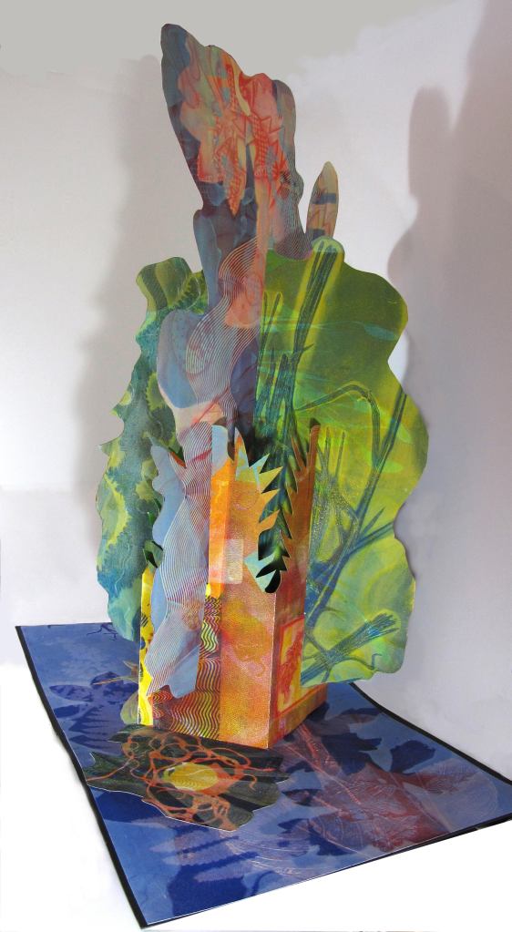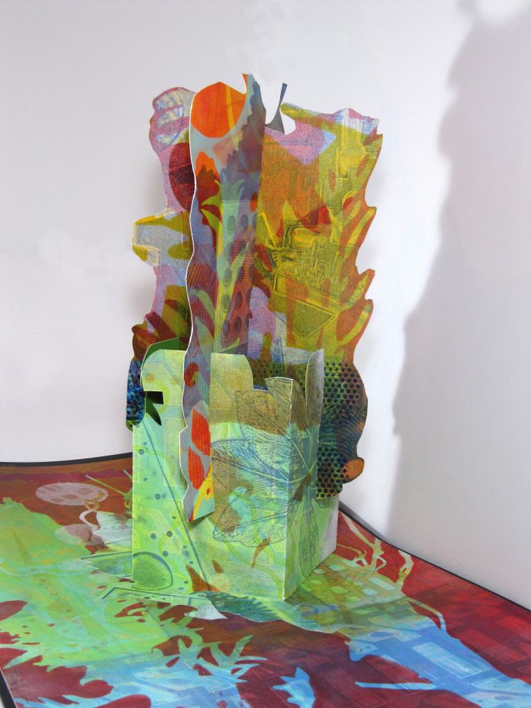 These pieces are paper engineered sculptures made from monotypes which are cut, collaged and assembled into 3 dimensional pieces. They are engineered to fold flat or stand up.