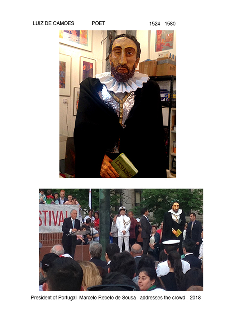 In 2018 I was commissioned to build a seven foot tall statue of the poet Luiz de Camoes , the “Shakespeare” of Portugal for the Portugal Day celebration in Boston. Previously there had been a Portugal Day Parade going down Cambridge Street in Cambridge, the heart of Cambridge’s Portuguese neighborhood. In 2018 the event was held in Boston City Hall Plaza. The president of Portugal, Marcelo Rebelo de Sousa and other dignitaries spoke. The music and poetry of Portugal was celebrated.
